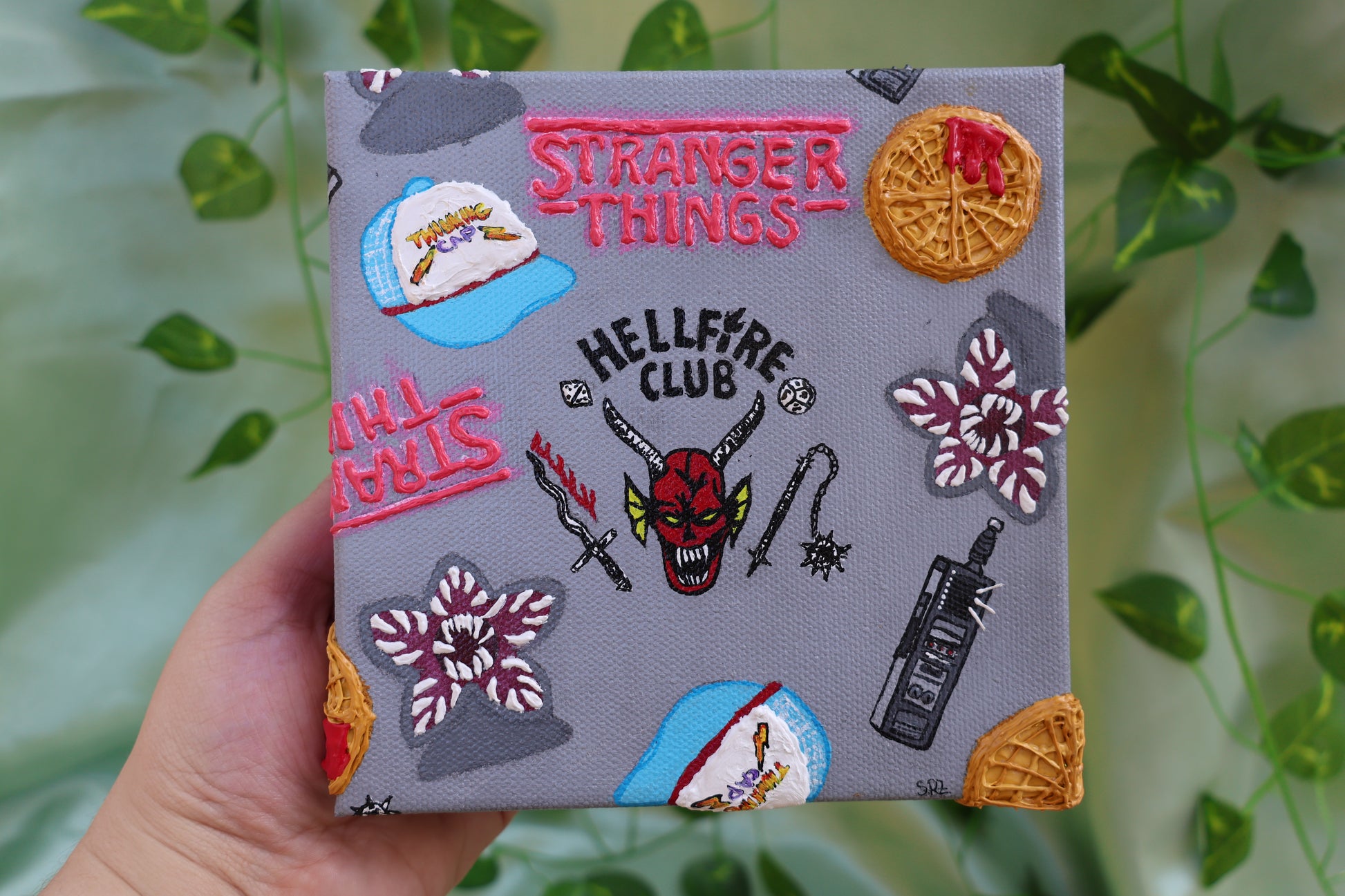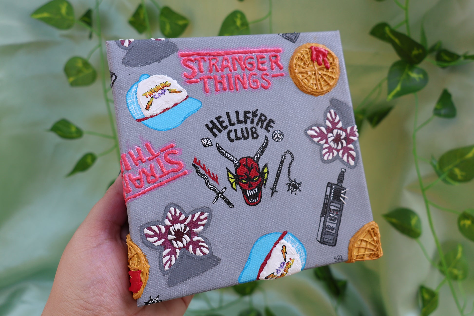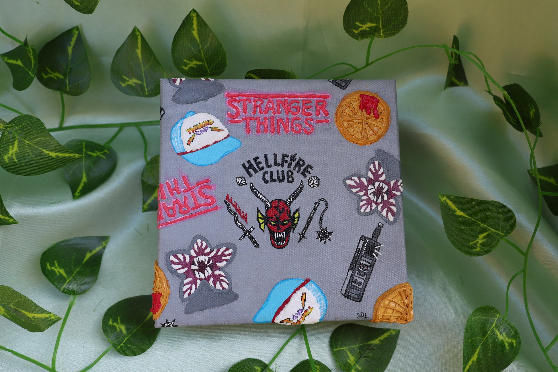 Step into the upside down with this stranger things inspired textured painting. Featuring waffles, hell fire club, walkie, thinking cap, & demogorgons.