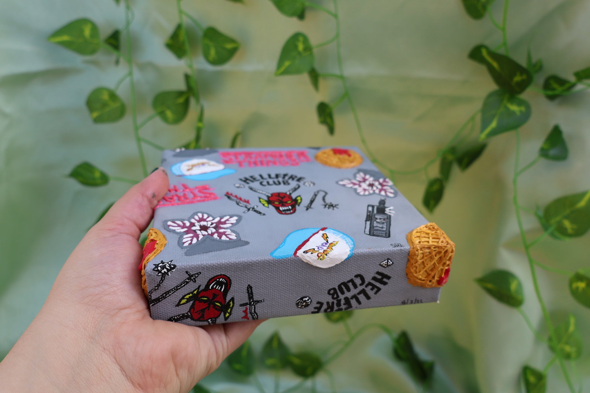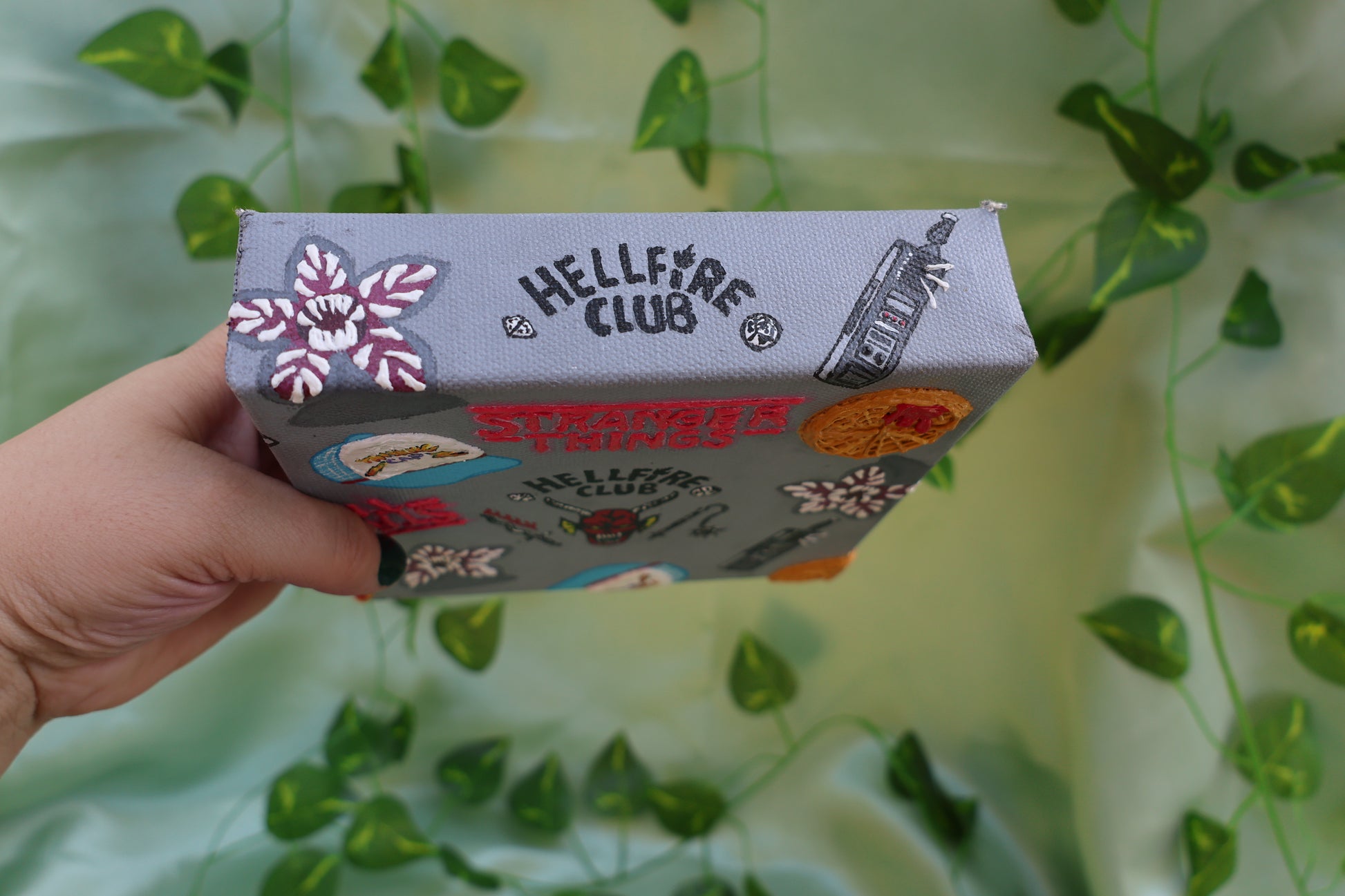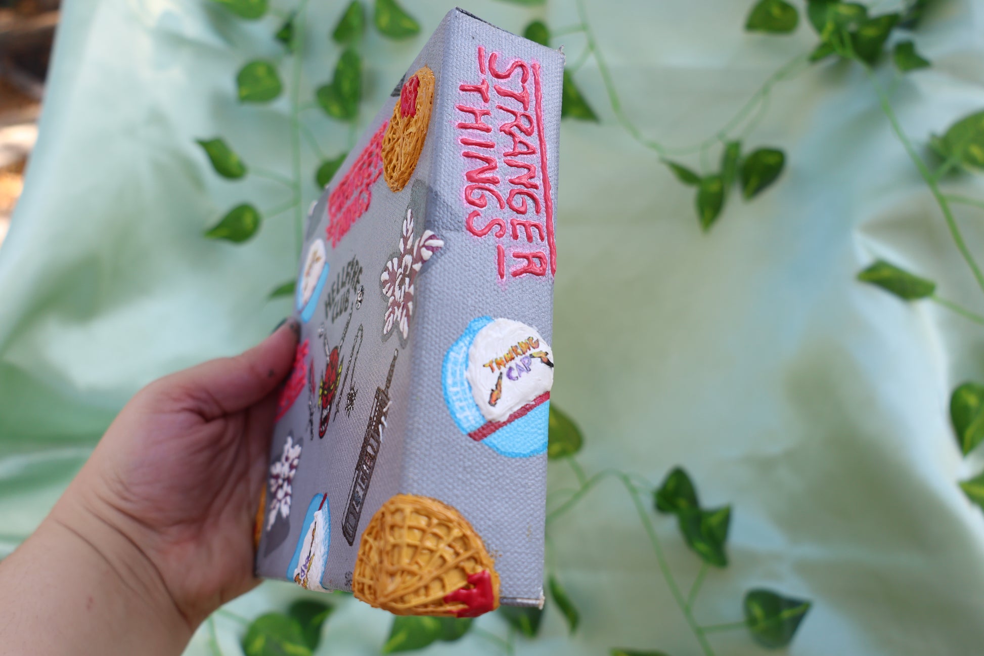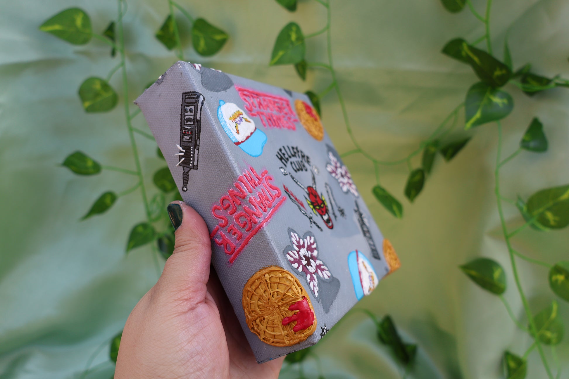 Step into the upside down with this stranger things inspired textured painting. Featuring waffles, hell fire club, walkie, thinking cap, & demogorgons.