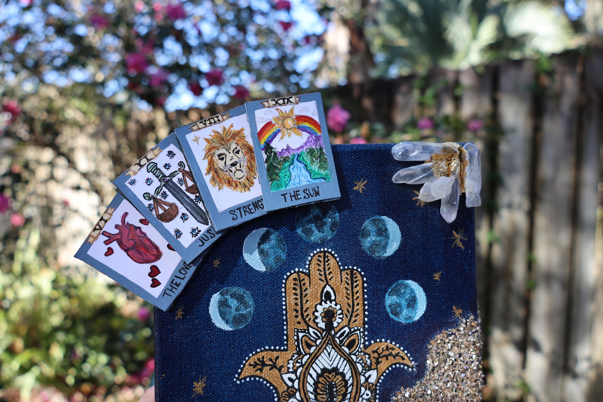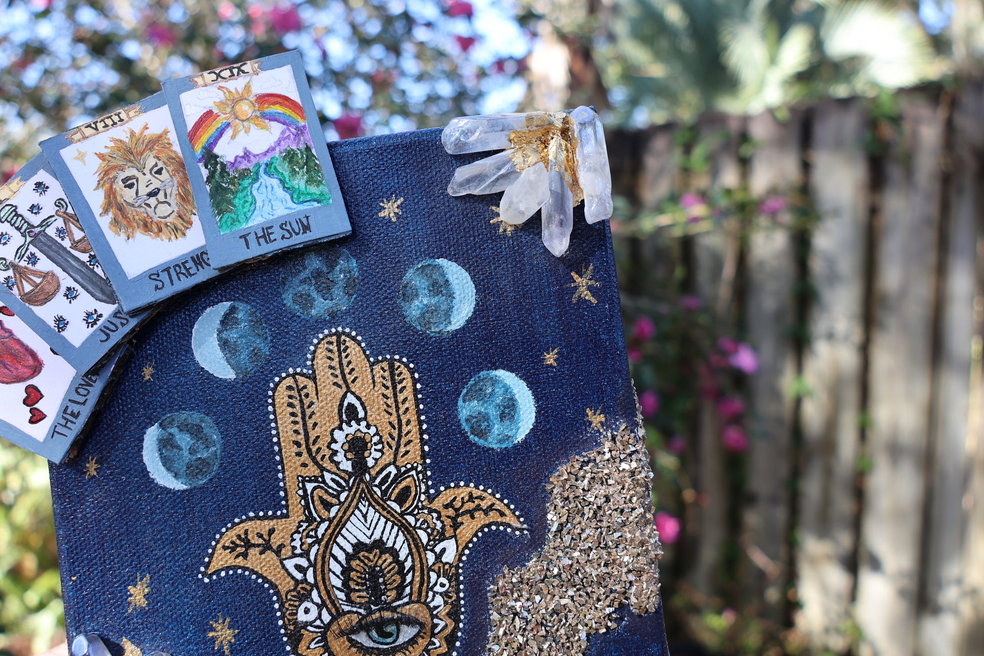 Featuring tiny hand paint tarot cards, The Lovers, Justice, Strength, & The Sun. Along with flux lash, clear crystals, flux gold flakes and glitter. Acrylic paint, a protective varnish finish. Created on a 6x6 heavy duty canvas.